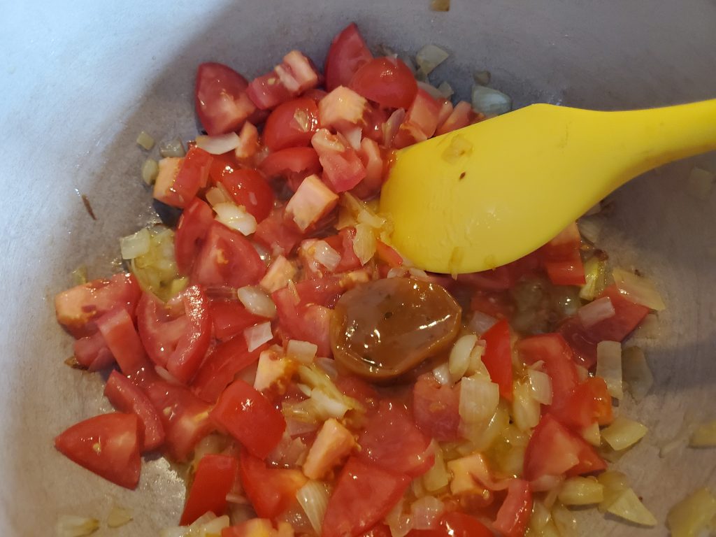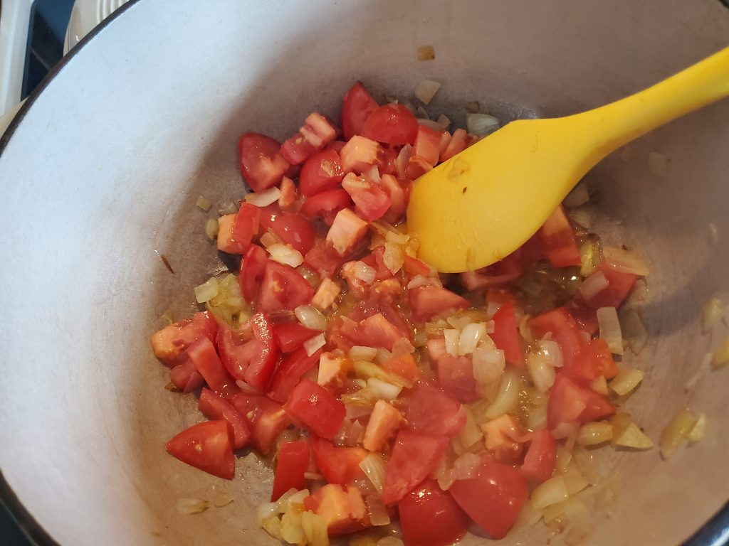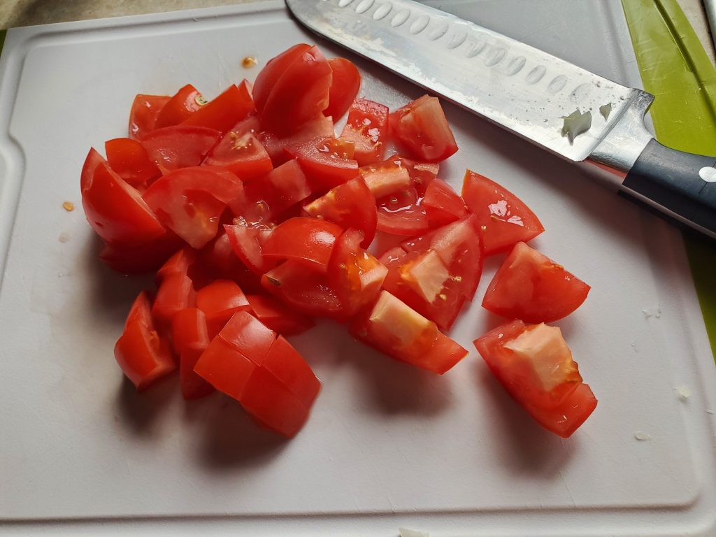 STEP TWO: Add the three sad looking Roma tomatoes juice and all. I’m hoping to not add juice/liquid if I can avoid it.
