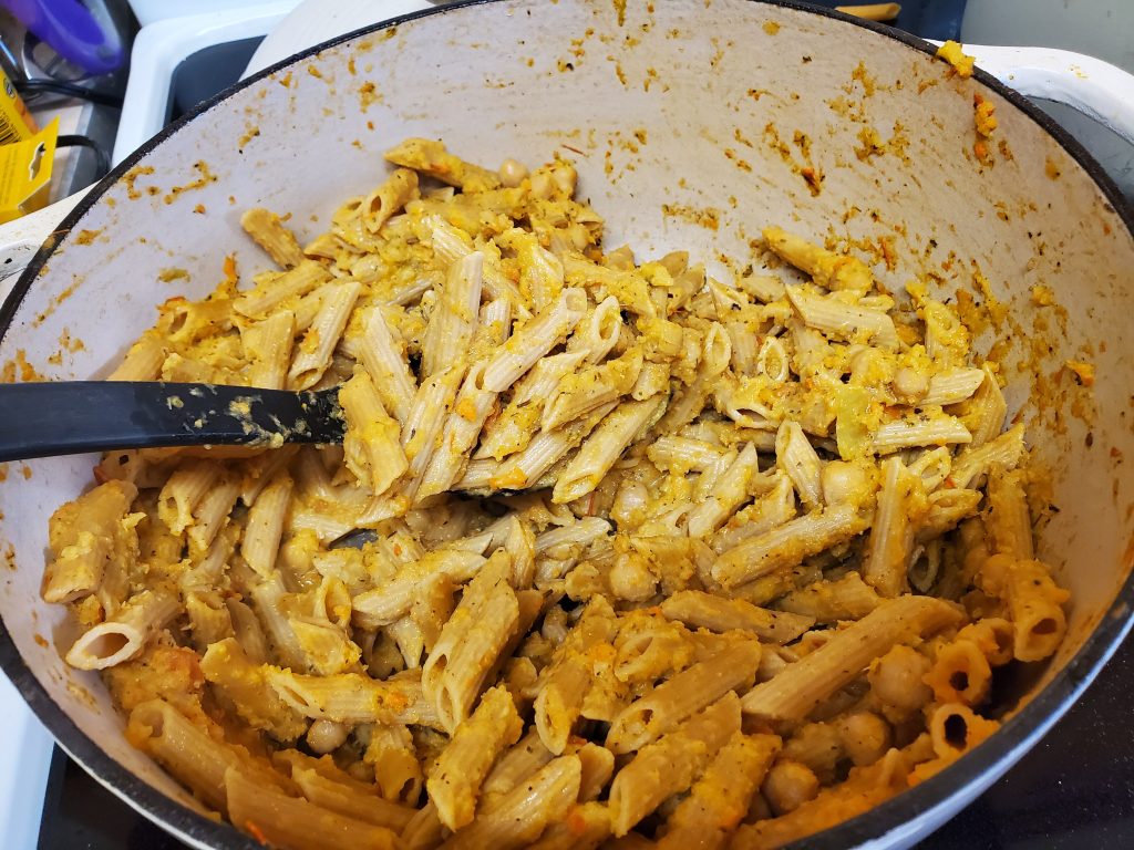 STEP EIGHT: After a taste test I decided it needs more salt. I gave it another blend and added the chickpeas. As I expected, the pasta water is taking ages so hopefully it will all be done at the same time. But for now, I like this weird orange meal. It could use a salad but tonight it will just be pasta and bread and butter as we had a very late lunch, and I don’t expect super hungry people at my table (Future note, they all ate surprisingly well!).