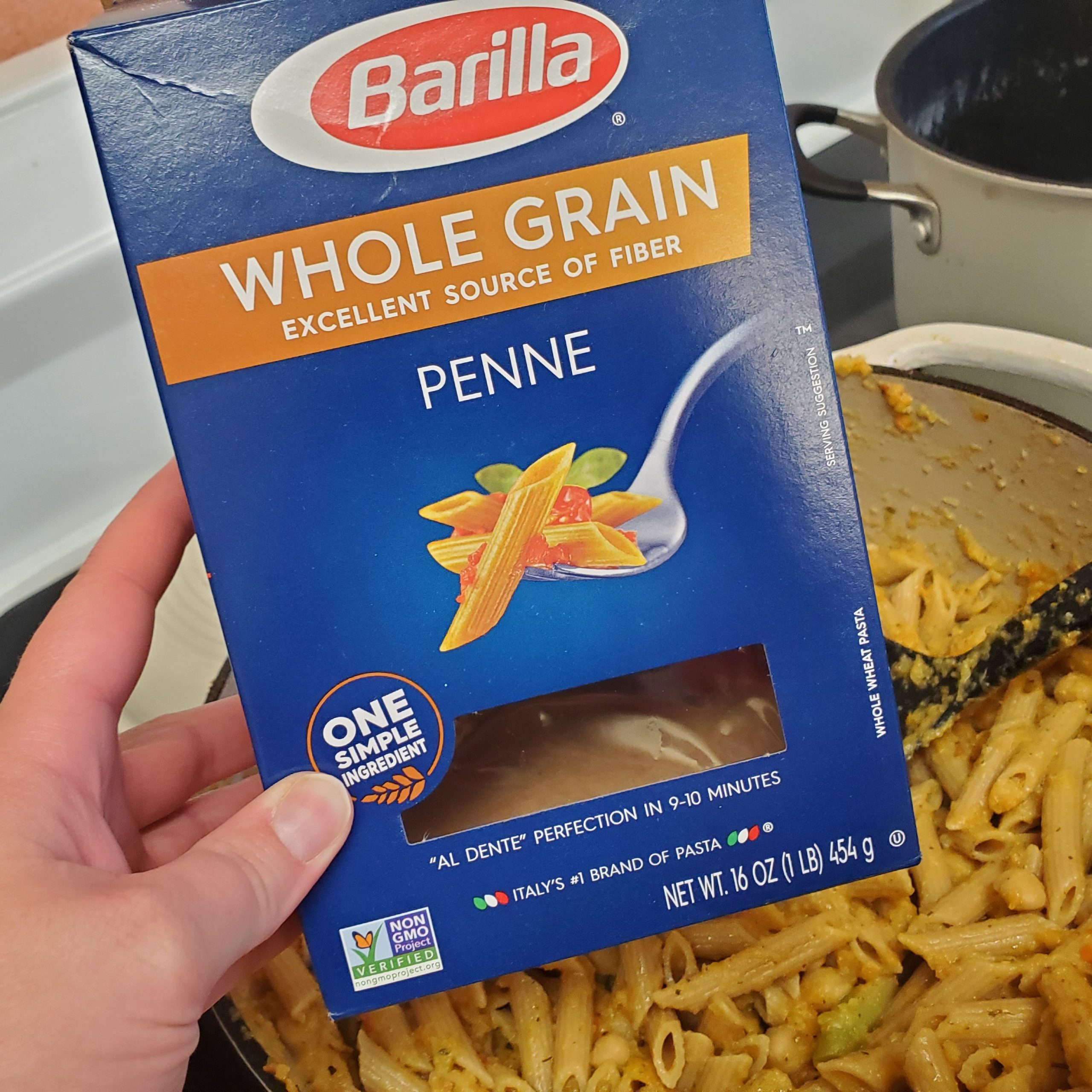 STEP SIX: After about 15 minutes since I added the tomatoes, we have a low boil. I am turning the temp down to about 3 and letting it simmer until all of the veggies are cooked down enough to blend; keeping an eye on the water content so that nothing burns. And since we have a stubborn stove top, I will be starting the pasta water for the noodles. We have a ton of whole grain pasta due to the blessing of WIC and we will be using some Penne tonight.