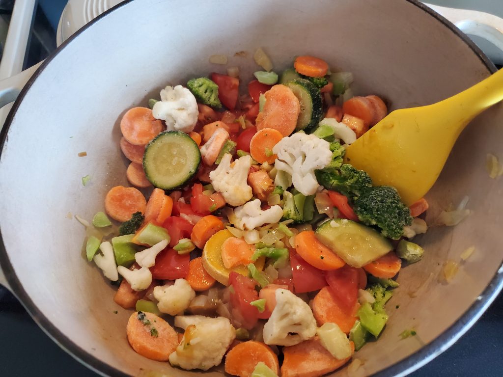 STEP FOUR: Dump in the bag of frozen veggies and let cook a bit to see what water from the frozen veggies and tomatoes and jiggly stock gives us. I’ve stirred once at 5 minutes, and I’ll give it another 5 and see what we’ve got. I am looking for something I can blend with my little immersion blender.