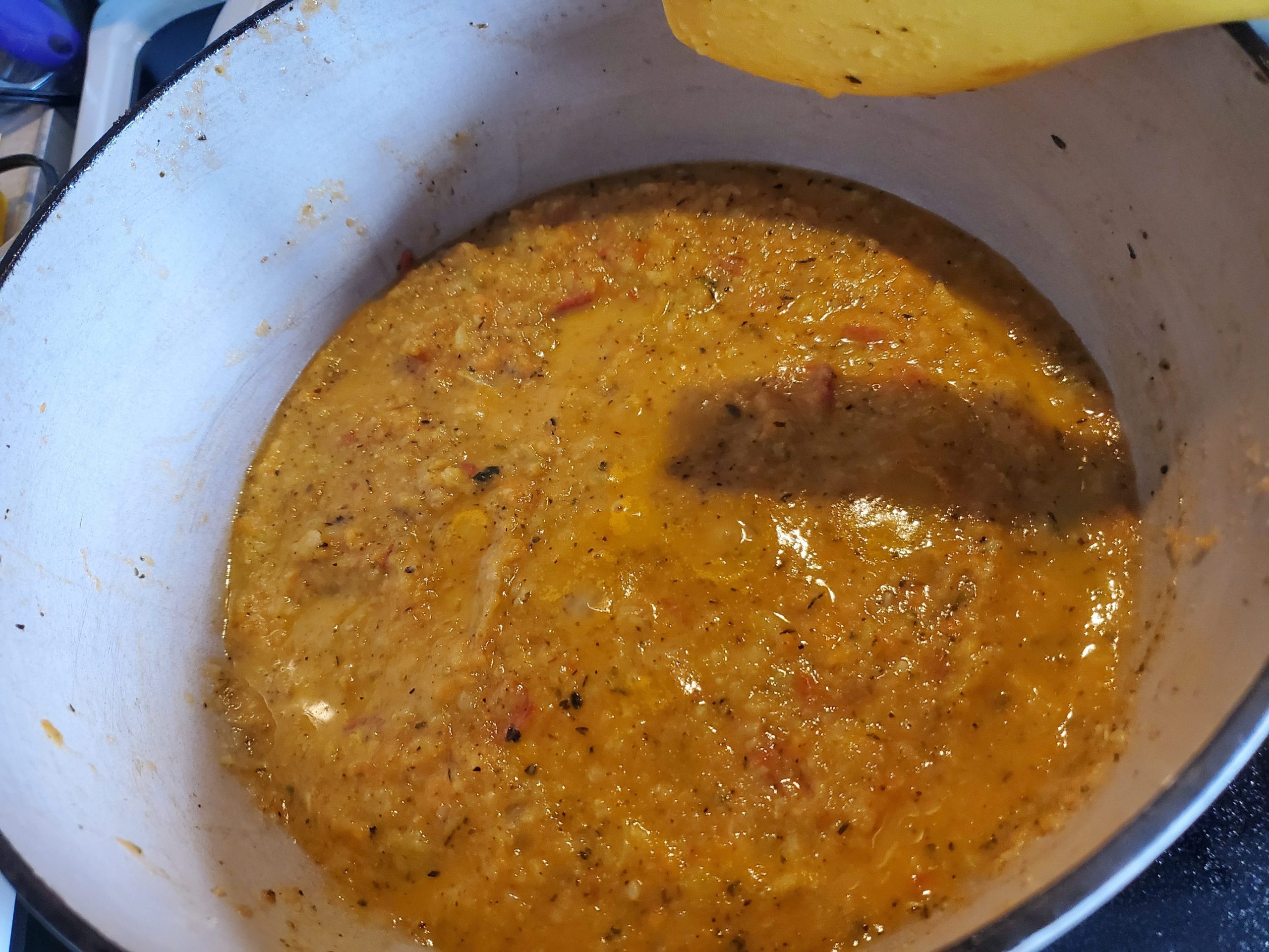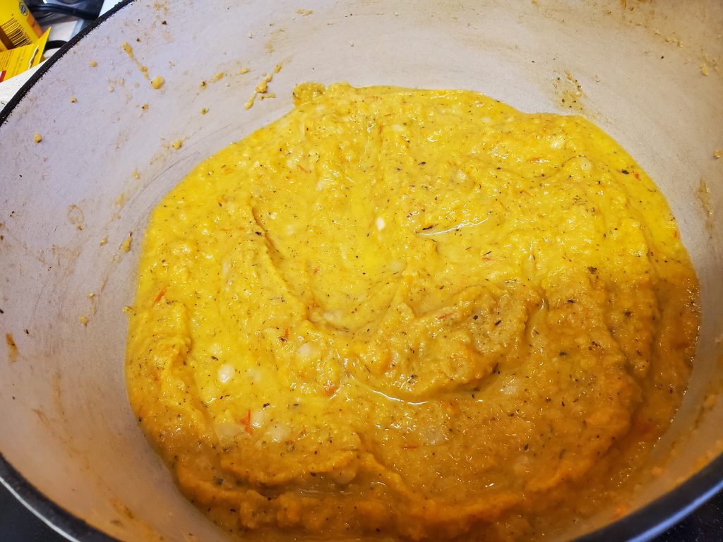 STEP SEVEN: After adjusting the temperature a few times and landing on 4/5, give it an immersion blend (or stick in a blender) and discover that not all of the veggies were ready to be blended. It looks a bit like this now after about 30 minutes on the stove. I’m going to cook it down some more and then give it another blend and add a can of chickpeas for protein.