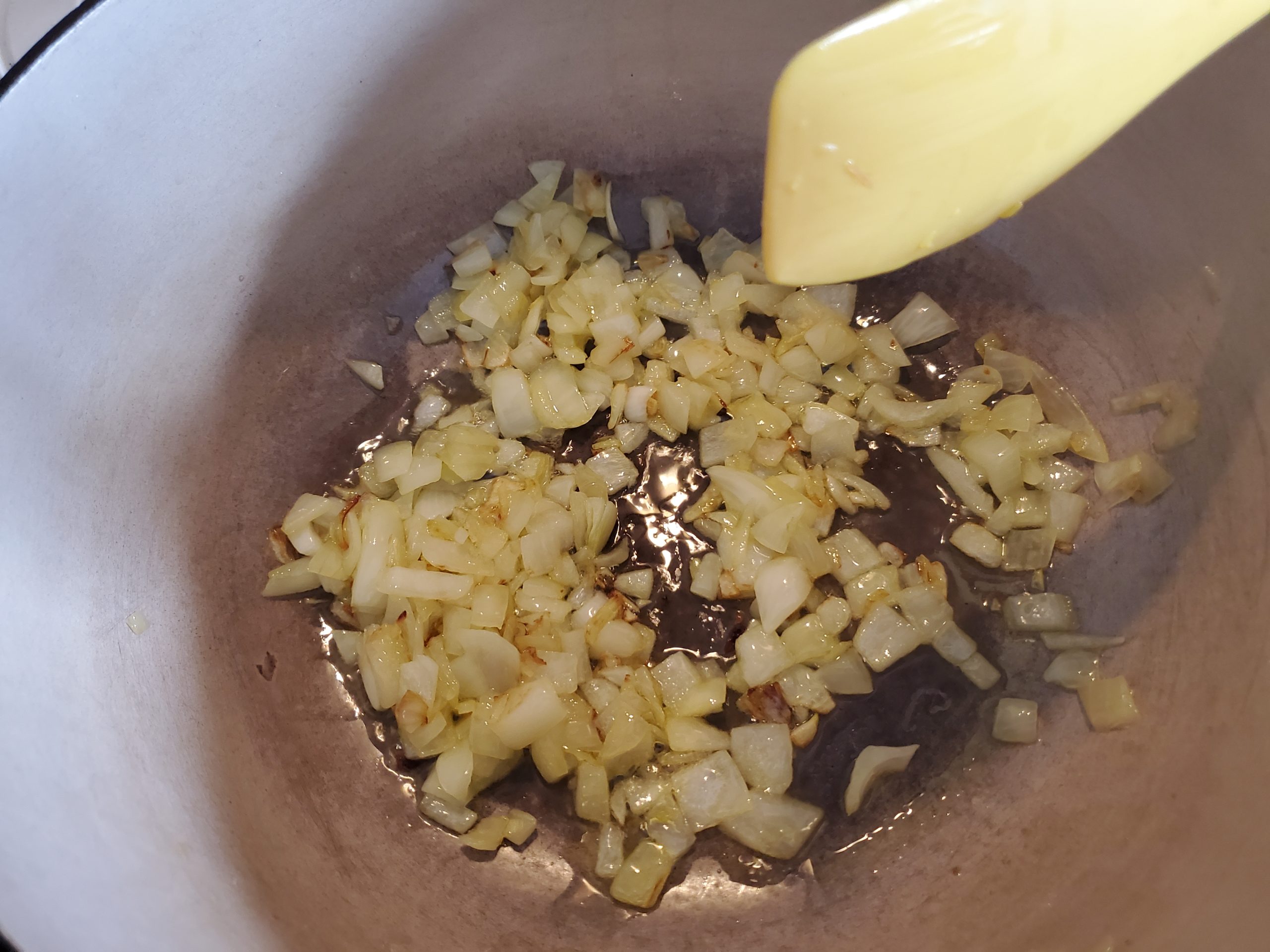 STEP ONE: With what I am guessing is 3-4 tablespoons of olive oil, sauté the onions. I did this in my enamel Dutch oven as the pot I would make sauce in will be the noodle pot tonight.