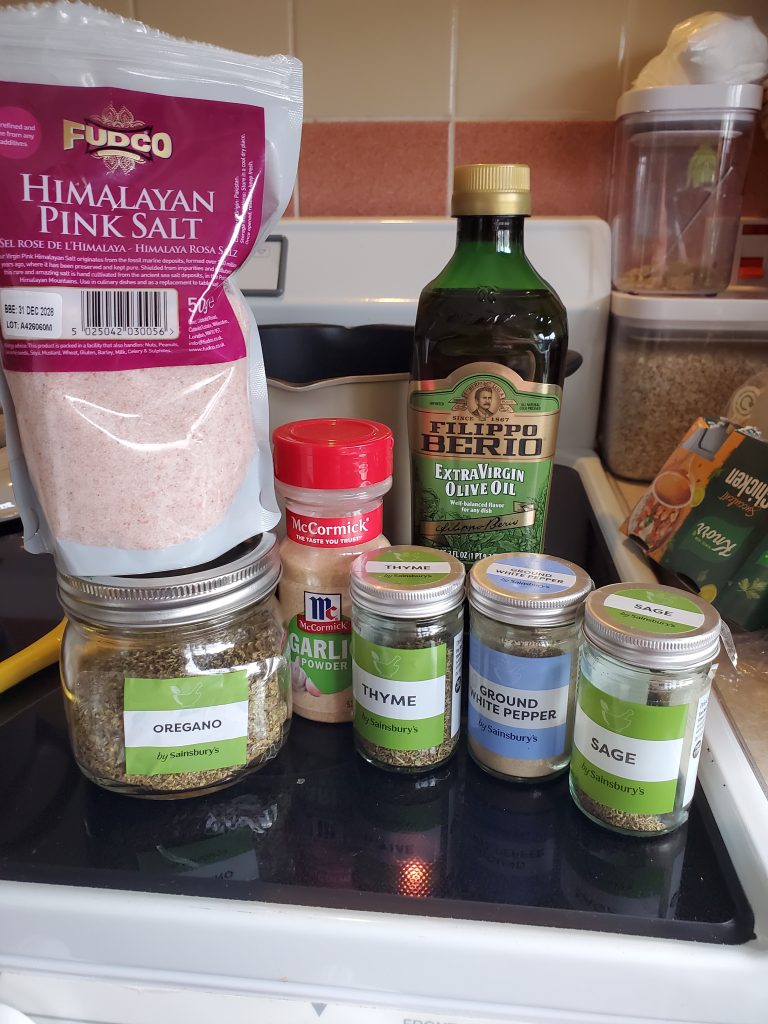 STEP FIVE: It needed liquid. I added about a cup of water and it’s looking good. Going to add some flavor to it with seasonings and maybe a bit of salt. The stock has salt in it so I’ll be going by smell and taste rather than measurements. Here’s what I am using. I would say I used about 1/4 teaspoon of white pepper and 1/2-1 teaspoon of everything else. I have a can of Stewed tomatoes with celery and bell pepper on stand-by for more tomato-ness (Did not end up using). It’s really whatever I have now as a friend just moved away and gifted us several canned goods. (Edit after cooking: I did add a couple dashes of nutmeg.)